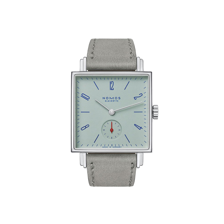 ساعت نوموس تترا ماچا (Nomos Tetra Matcha Ref. 495) یکی از مدلهای خاص و ظریف مجموعهی Tetra از برند آلمانی Nomos Glashütte است. این مدل با قاب مربعی ۲۹ میلیمتری از جنس استیل ضدزنگ و صفحهی سبز ملایم ماچا، جلوهای مینیمال و در عین حال جسورانه دارد. عقربههای نقرهای، اعداد آبی و سابدایال ثانیهشمار قرمز در پایین صفحه ترکیبی هماهنگ و چشمنواز ایجاد کردهاند. موتور دستی Alpha ساخت خود نوموس دقتی مثالزدنی را تضمین میکند، و بند جیر طوسی رنگ، حس اصالت و لطافت طراحی آلمانی را تکمیل میکند.