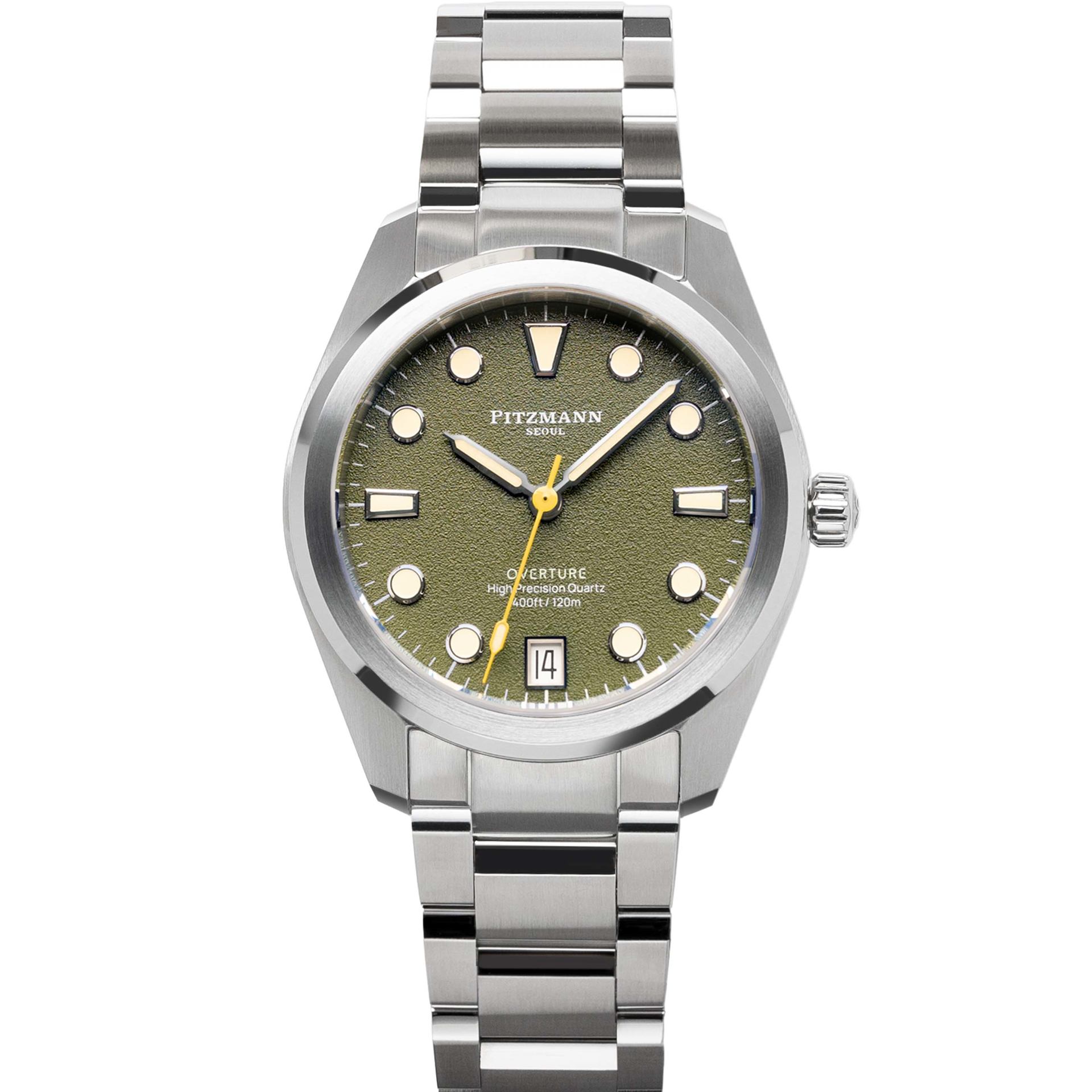 ساعت Pitzmann Overture Khaki Green با صفحهی سبز خاکی خاص خود، جلوهای برجسته و در عین حال طبیعی از سبکهای مدرن دارد. رنگ سبز با تهرنگهای طبیعی، اشارهای به ماجراجویی و زندگی در فضای باز دارد، در حالی که طراحی مینیمال صفحه باعث میشود ساعت در استفادهی شهری و روزمره نیز بسیار جذاب باشد. شاخصهای دقیق و عقربههای هماهنگ با صفحه، خوانایی بالا و حس پویا را برای کاربر فراهم میکنند.